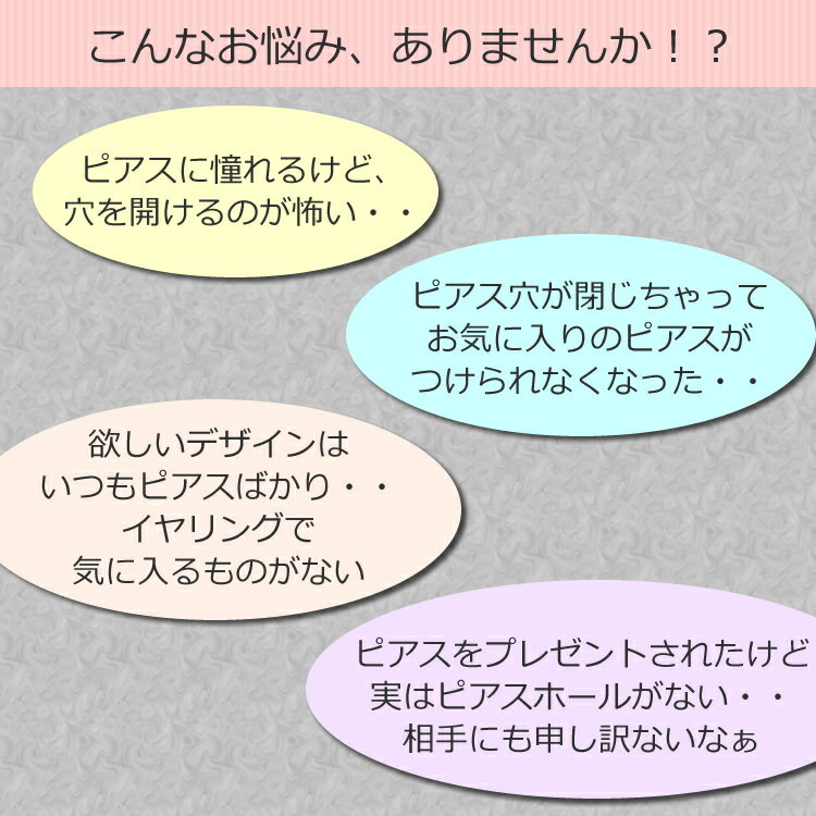 【メディアで話題沸騰!】ピアスがイヤリングに早変わり! ピアスホールがなくてもお気に入りのピアスがつけられます! こんなお悩み、ありませんか!? 「ピアスに憧れるけど、穴を開けるのが怖い・・」 「ピアス穴が閉じちゃってお気に入りのピアスがつけられなくなった・・」 「欲しいデザインはいつもピアスばかり・・イヤリングで気に入るものがない」 「ピアスをプレゼントされたけど実はピアスホールがない・・相手にも申し訳ないなぁ」 そんなお悩みは、イヤリングコンバーターが解決します! 【1】コンバーター下部にある筒にピアスを差し込む 【2】ピアスの落下防止のためにキャッチをつけることをおすすめします(別売り) 【3】クリップ式オメガイヤリングのため、耳たぶの薄いところから差し込み、お好きな位置までスライドさせて装着してください 【対応ピアス】 スタッドピアス アメリカンピアス フープピアス フックピアス 軸太セカンドピアス セット内容 イヤリングコンバーター(ペア) 一粒ピアス(ペア) シリコンキャッチ(ペア) 材質 樹脂製 大きさ 全長(高さ)約15mm×(横)約7mm 留め具幅約1〜3mm ピアス石約2mm 留め具 クリップ式オメガイヤリング 重さ ピアスなし片耳あたり 約0.075g ピアスあり片耳あたり 約0.161g ピアス落下防止のために コンバーターからピアスが落下するのを防ぐため、ピアスキャッチをつけることをおすすめします。