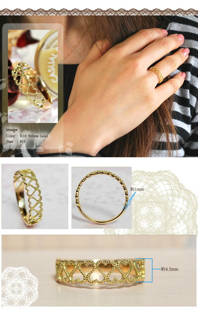 大きさ 最大 幅:約4.5mm 厚み:約1.0mm 材質 地金 K10/K18ホワイトゴールド K10/K18ピンクゴールド K10/K18イエローゴールド 備考 * 宝石にはひとつひとつに色味のちがいや濃淡があるため、またご使用のブラウザによっては画像と実物に若干の違いがでる場合がございます。